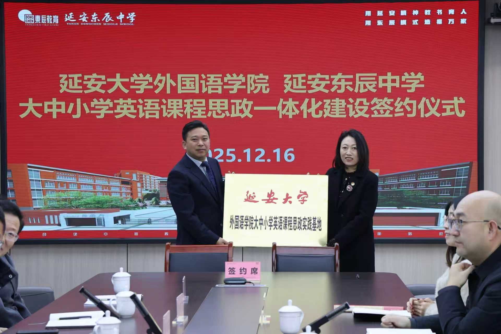 作者:徐洁 核稿:常琅为进一步深化大中小学思政教育一体化建设,服务学校红色资源育人示范校建设。12月16日,我院与延安东辰中学举行“大中小学英语课程思政一体化建设”签约和授牌仪式。延安励博教育集团党总支书记韩卿元、延安东辰学校校长李立刚、副校长、高中部校长李国江、副校长王永强、初中部书记张怀志、初中部校长王国聪、附属小学校长王金玲、教研部长郝炳宏,学院党委书记梁艳、副院长常琅、雷琨及两校师生代表出席仪式。...