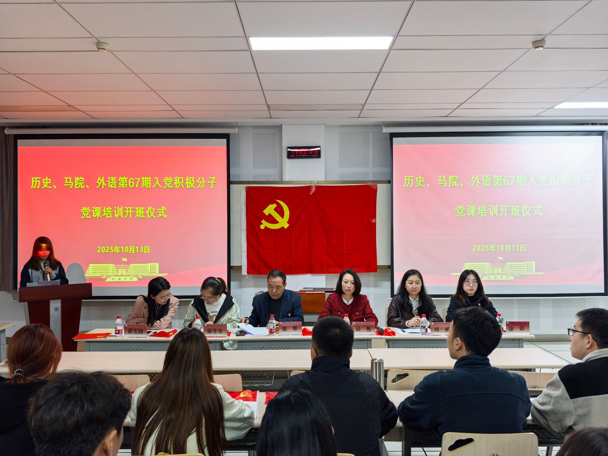 2025年10月13日晚,外国语学院,马克思主义学院,历史文化学院分党校第67期入党积极分子培训班开班仪式在外语楼211教室庄严举行。外国语学院党委书记梁艳,马克思主义学院党委书记张彬,历史文化学院党委副书记刘艳,外国语学院组织员徐洁,马克思主义学院组织员苗玉园,历史文化学院组织员雷升琴以及95名参训学员共同出席了仪式。仪式由外国语学院党委书记梁艳主持。